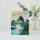 a traditional watercolor landscape painting of green mountains in front of a lake and green jungle under a colorful sunset on a postcard