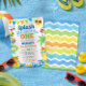 The bold, playful typography paired with whimsical water splashes creates a fun and energetic look that’s perfect for a backyard splash pad party, pool celebration, or lakeside birthday bash. This invitation is designed with a clean white background and colorful border illustrations for a bright, crisp finish.