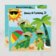 Our Beach Turtles birthday invitations are colourful, cute, fun, cheery, and easy to customise with your child's birthday party specifics! These cute turtle theme birthday invitations feature a bright blue background of sky and water, a sandy beach, palm tree, sun and three turtles wearing sunglasses, a bright striped beach umbrella, even a crab!