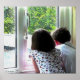Boy and girl looking out a window at the summer rain