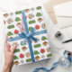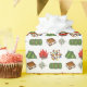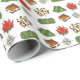 Gift wrap design features an original marker illustration of classic camping themed designs including a campfire, s'mores, trail mix, tent, and sleeping bag.