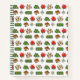 Spiral notebook design features an original marker illustration of a camping-themed compass, trail mix, campfire, s'mores, tent, and sleeping bag. Great for summer camp!