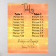 8x2 Seating Charts for parties, weddings, birthdays, quinceaneras, and other events. Summer Rustic Casual Yellow Peach Happy Mellow Pattern Table Seat Assignments for 8 person tables. This is two tables design, single-sided with a white back (the back is blank with no text or design on the back). Celebrate your casual summer nuptials, renewal of vows or other occasion with this Happy Mellow orangey yellow and rosy peach casual pattern design. Single-sided design. This design works for all ages and genders, and is great for spring and summer. Design created from an original photograph taken by the designer of a sunset in San Diego, California, then digitally texturised. Design description: The design is in four parts. The top part is a rosy peach colour, the second part goes from the rosy peach colour to a medium yellow, and the bottom two sections are of the medium yellow. The sections are divided by rough lines that are lighter than the main colours. The entire design has spots that make it look distressed, as if the colours were casually and incompletely applied. Text description: The front text has the text template Tables at the top. Below that, two columns, one for Table 1 and the other for Table 2. Each table has 8 seats, labelled 1-1, 1-2, etc. At the bottom, templates for the names of the newlyweds and the date.