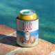 Summer Christmas with Santa Claus at beach funny Can Cooler for party. Santa Claus coming to the beach for a summer Christmas party? That's not something you see every day! But it's sure to be a lot of fun. And what better way to keep your drinks cold than with a festive can cooler?