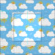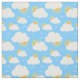Sky blue fabric with a summer pattern of white fluffy clouds and orange suns