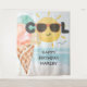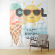 Summer theme kid's birthday party backdrop features a watercolor beach, ice cream cone, a happy face sunshine wearing "cool" shades and text that can be personalised. Art by KL Stock.