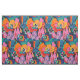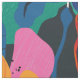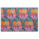 A bright coloured abstract summer floral pattern in shades of gold, orange, pink, blue and green.