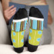 Summer Garden socks with a green background and flowers of blue and yellow with blue birds and a striped area of brown, green, white, and blue near the toes.