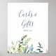 This summer greenery cards and gifts sign is perfect for an elegant midsummer wedding or bridal shower. The botanical design features a lush arrangement of painted watercolor eucalyptus, greenery, and green leaves with subtle sprigs of blush pink blossoms. The line of text at the bottom of the sign can be personalised with the date, the names of the bride and groom, or a short message like "Thank you". This sign can be used for a wedding or any event or party.