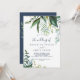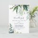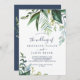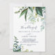 This summer greenery wedding invitation is perfect for an elegant midsummer wedding. The botanical design features a lush arrangement of painted watercolor eucalyptus, greenery, and green leaves with subtle sprigs of blush pink blossoms.