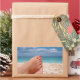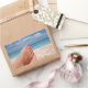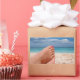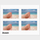 Rectangular photo sticker with women's feet with pink red nail polish on a white beach on an island in the mediterranean sea relaxing during the summer holidays.