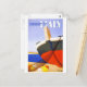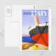 Beautiful vintage travel poster designed by Alfredo Lalia and depicting the joys of a summer holiday in Italy. The image shows blue sky, blue sea, the hull of a boat pulled up on the beach, a fishing net and lemons and peaches.