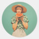 A cheerful woman in a sunhat and floral shirt enjoys a slice of watermelon against a vibrant teal background, capturing a perfect moment of summertime happiness.