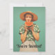 A cheerful woman in a sunhat and floral shirt enjoys a slice of watermelon against a vibrant teal background, capturing a perfect moment of summertime happiness.