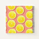 A pattern of fresh & juicy lemon slices in bright, vivid shades of yellow, with a watercolour texture to give it that freshly cut look. They are placed on a salmon pink background for a bright & summery look, like pink lemonade.