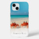 This iPhone 15 tough case features two sun-loving crabs chilling at the edge of a soft ocean-to-sand gradient—literally. Their little crabby paws trail right off the front, wrapping around the case edges for that unexpected art-in-motion look.