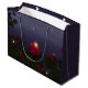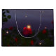 In the dusk of a summer night fireflies float and glow over a rose garden filled with vibrant red roses.