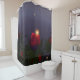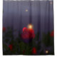 In the dusk of a summer night fireflies float and glow over a rose garden filled with vibrant red roses.