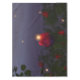 In the dusk of a summer night fireflies float and glow over a rose garden filled with vibrant red roses.