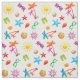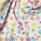 Sewing and crafting fabric with a summer pattern design. Bright tropical colours make up this fun collection of seashells, starfish, palm trees, sunglasses, flip flop sandals, and more. Choose any background colour, in cotton, linen, twill, or leave it neutral.