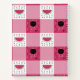 As an homage to the tasty treats of summer, this classic picnic tablecloth pattern is adorned with a slice of watermelon surrounded by ants and seeds in the white squares and a kettle grill framed by steaks, mushrooms, and charcoal pieces in the other. On the front a picnic basket silhouette creates a cute mask for the pattern.