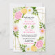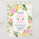 This fun and whimsical wedding invitation features watercolor pink, yellow and white flowers with foliage on a gold geometric frame. The text combines handwritten script and serif fonts for a stylish and modern look. This is perfect for a spring or summer rustic wedding.