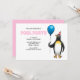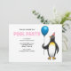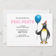 Invitation to the summer's birthday pool party. It is suitable for children and has a fun illustration with a penguin who are ready for the party.