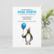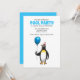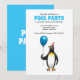 Invitation to the summer's birthday pool party. It is suitable for children and has a fun illustration with a penguin who are ready for the party.