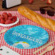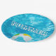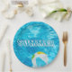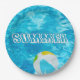 "summer" text in wavy font effect for swimming pool party with splashing beach ball in turquoise pool water.