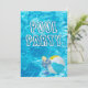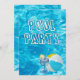 Swimming pool party invite with drinks and beach ball in turquoise water.