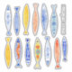 Colourful fish in shades of blue, orange, and yellow. Inspired by Mediterranean sardines and Scandinavian design, these are the perfect pop of colour to any of your favourite gear or stationery. 13 individual fish stickers on one sheet.