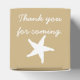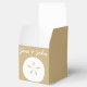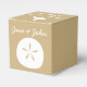 Give your guests, bridesmaids, groomsmen, or anyone else a special treat with these customisable favour boxes featuring a sandy tan background with a white sand dollar, seashell, and starfish on the front, back, and top of the box, respectively. Each of these sides also features some sample text that you can customise for your own summer or beach-themed wedding or event. Be sure to check out the other products in the Summer Seashells in Sand set to create a truly coordinated look for your event.