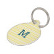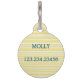 Two side dog ID tag with a yellow petit stripes background on the front and a monogram in sans serif font. The back side holds the dogs name and owners phone number with same background.