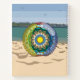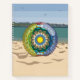 This beach themed mandala features layers of seashells, sailboats, sand, sun, sea, and palm trees inside of a transparent beach ball to bring to mind the fun that comes with summer. The beach ball sits in the sand against a beach and ocean background.
