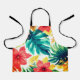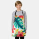 This Apron for kids, features a colorful floral design infused with orange, red, and yellow flowers, showcasing flourishing blooms and large tropical leaves artfully arranged across the fabric. Nice for bringing a cheerful summer vibe to a kitchen space, this apron is adding a splash of color to cooking experience.