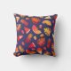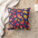 This throw pillow features a pattern of bright orange, red, and gold summer fruits on both sides. The fruit images include watermelon, pineapple, and strawberries, along with tropical leaves. Everything is placed on a complementary navy blue background. Great for a sun room or patio!