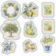 A charming set of watercolor lemon-themed stickers, featuring detailed illustrations of lemon wreaths, blossoming branches, vintage postage stamps, lemon trees, refreshing lemonade jars, butterflies, and a classic yellow Vespa scooter. The designs blend a Mediterranean and Italian summer vibe with fresh citrus tones and botanical details. Perfect for your notebook, planner, laptop...