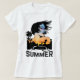 This image is a stylised graphic that combines several elements to evoke a summer theme. At the centre is a silhouette of a woman's head with flowing hair, which is filled with a vibrant sunset scene featuring palm trees and a car. The sunset colours transition from deep orange at the horizon to lighter shades of blue and purple as they move upward, creating a striking contrast with the black silhouette. Below the image, the word "SUMMER" is prominently displayed in bold, uppercase letters, with a stylised underline that resembles a road or a wave, further emphasising the summer and travel theme. This image is interesting because it creatively merges different symbols of summer—such as sunsets, palm trees, and road trips—into a cohesive and visually appealing design.