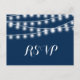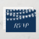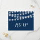 Modern Summer Wedding RSVP String Lights Design in blue with simple yet elegant glowing white string lights hanging across the top with a stylish mix of modern typography on a summer night dark blue background. A simple and trendy, preppy design, perfect for summer! Click the "CUSTOMIZE IT" button to customise names,address, text,fonts, move text around,change the background colour and create your own unique one-of-a-kind RSVP card design.