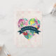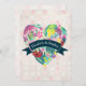 A summery wedding invitation with an illustrated heart filled with flowers and leaves in pink, green and yellow colours. The bride and grooms names written in curved text inside a blue-green ribbon layered over top the heart. The background is a faded pattern with circles in light pink and white.