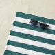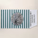 All of the details on this towel can be personalised including the family name, trip location, and year. The design features a seafoam and white striped background, with an emblem detailing a palm tree and ocean waves under the sun. This design can be transferred and printed on beer coolers, tote bags, shirts, and more. Contact the design for help if needed.