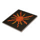 This sun art ceramic tile is orange and golden yellow on a dark background.