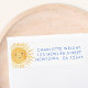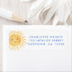 This baby shower return address label is decorated with a cute yellow watercolor smiling sun and blue typography.