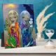 "Sun Child and Moon Child" - one of my favourite paintings to date, I love the colours in this one. Loosely inspired by the song "Moonchild" by King Crimson - these sisters stand together, but separately - representing the sun (on your left) and the moon (on your right). The sky & sea are both shown here reflecting the day/night dichotomy. Sun Child is cradling a chalice holding the light of the sun, and Moon Child carries a vessel containing the crescent moon. A rooster represents day/morning, and the moon-bunny is for the night. This is a piece I debuted & sold at Dragon*Con 2011 - originally it was in a really neat diptych (two-panelled) altarpiece frame that my husband Matt made for me. Even though the original has sold though, I have prints & other merchandise featuring these beauties! My own original acrylic painting.