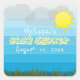 The design features a bright shiny sun, clouds and green grass on blue gradient stripes. The text of the name and the date is fully customisable.