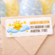 A cheerful watercolor sky illustration featuring a cute smiling sun rising above fluffy blue clouds and tiny golden stars. The warm yellow and soft blue palette creates a bright, playful atmosphere inspired by modern sunshine-themed baby celebrations in the U.S. The friendly illustration style paired with clean typography adds a charming and memorable touch to party stationery and envelope details.