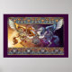 "Sun Horse, Moon Horse" is a colourful and detailed celtic design of two winged horses - one for the Sun, one for the Moon. Knotwork designs surround and include them, with other intricate borders appearing on their bodies. Above and below are wide borders with a design of interlaced dogs separated by the faces of the Sun (above) and Moon (below). The Moon shows her four phases across the border. "Sun Horse, Moon Horse" is also the name of a powerful, short book by Rosemary Sutcliff; the book is about the nature of art and the nature of leadership, and the creation of the Great Chalk Horse of Uffington. This painting has no connection with that book other than its title.