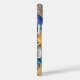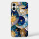 Elegant iPhone case featuring a stunning stained glass style celestial design with repeating sun and moon elements set against a deep blue galaxy background. The luminous gold accents create a bold, luxurious, and eye-catching pattern.