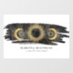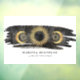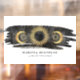 A celestial ethereal jewellery designer window cling featuring gold and black sun, moon and stars overlaid on a black ink brushstroke on white background.