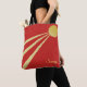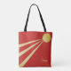 Elegant tote bag with sun rays on red background. Three rays emerging from the sun are three aspects of life: body, mind and spirit. The sunny text can be personalised.